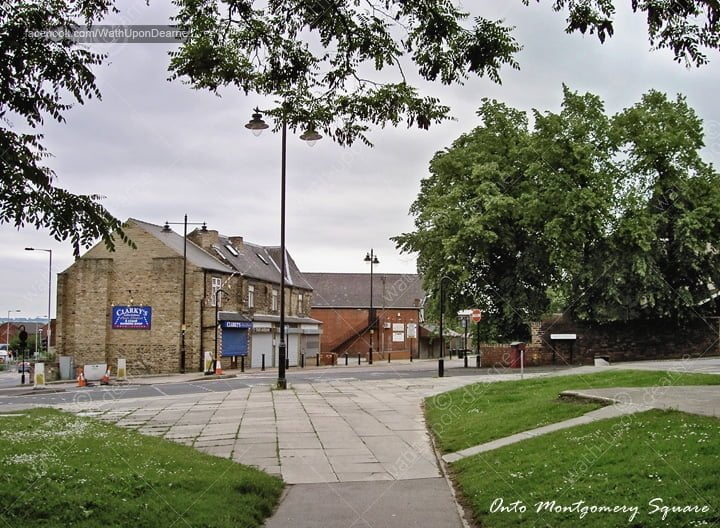 Road heading centre is onto Montgomery Square. Clarkys Gents Hairdressers in view with blue shutter.