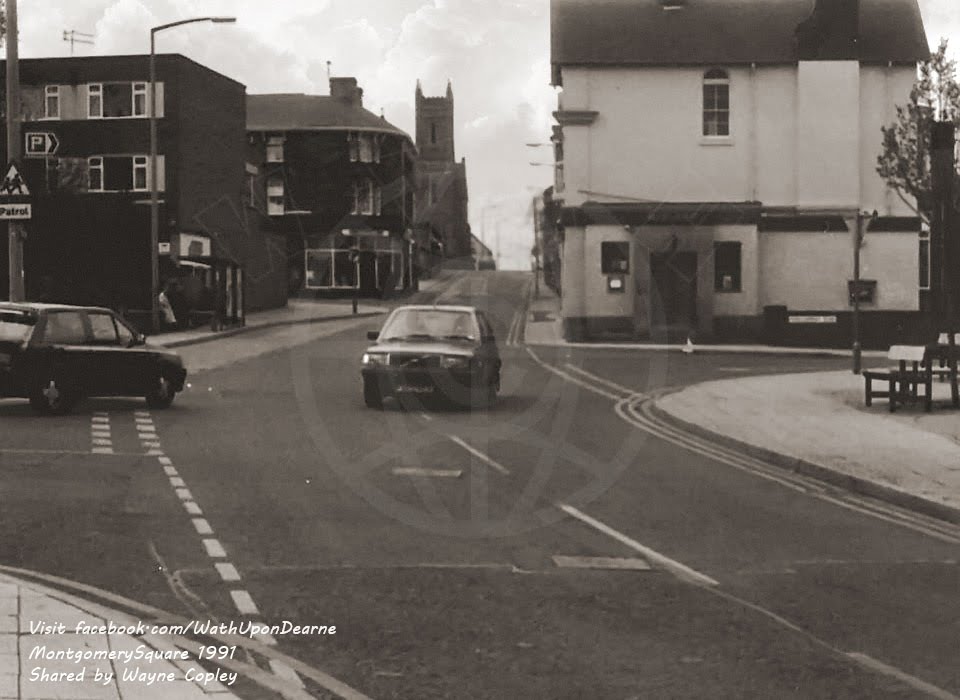 Montgomery Square in 1991 showing Midland bank, Possibly Hillards Supermarket and Bus Stop outside supermarket. In distance, top left Church and below possibly “Impressions For Men” clothes shop, formerley Wynnes od Wath and now florists.
