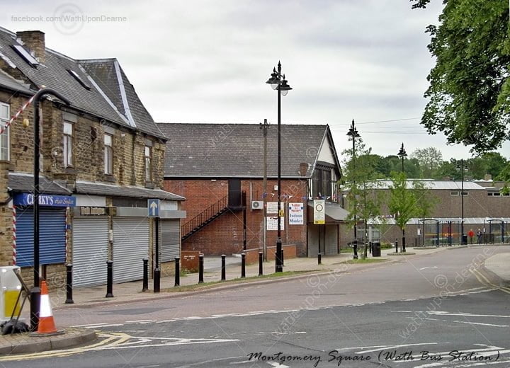 Bottom of West Street looking onto Montgomery Square. Left is clarky’s, Mini Market middle left and distant right is Wath-upon-Dearne BusĀ Station and the Community Library.