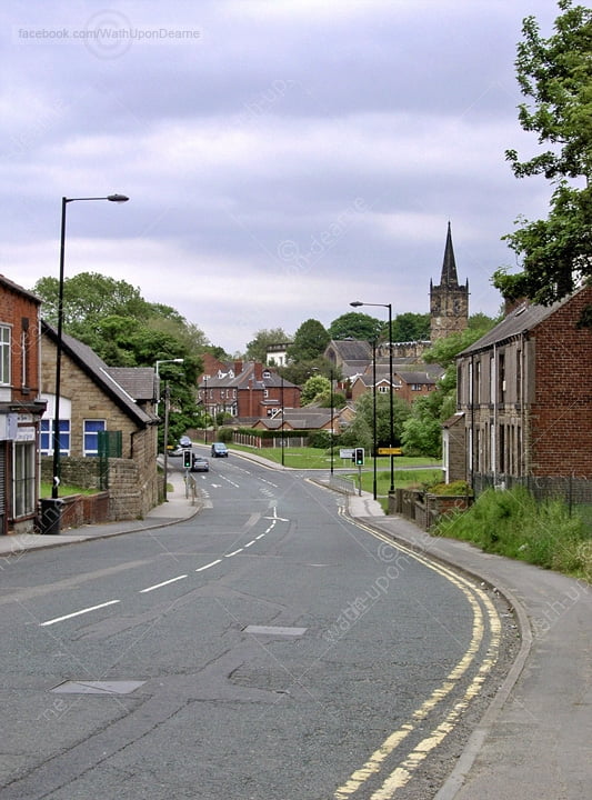 View down West Street heading to Wath-upon-Dearne town centre. In distance is All Saints Parish Church and turn off on right is onto Church Street